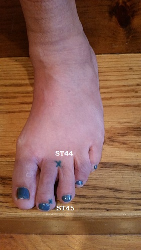 Massage these points by rubbing the area with your index finger or thumb. You can push on ST45 (near the toenail bed) using your fingernail to stimulate the point.
