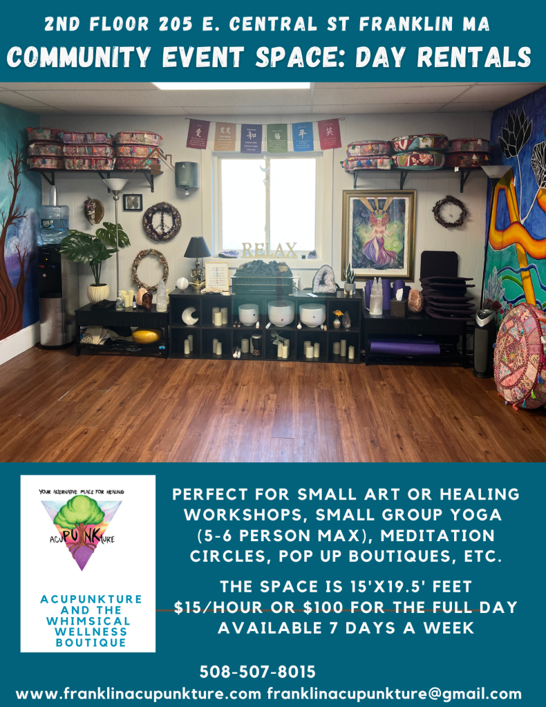 We have multiple rooms for rent in our Acupuncture Wellness Center: AcuPUNKture located on E. Central St Franklin MA on the second floor (no elevator sorry). We have 3 treatment rooms in total and all three come equipped with earthlite ellora tilt wide electronic tables. There is a sink for hand-washing on our floor and a bathroom on the first floor.