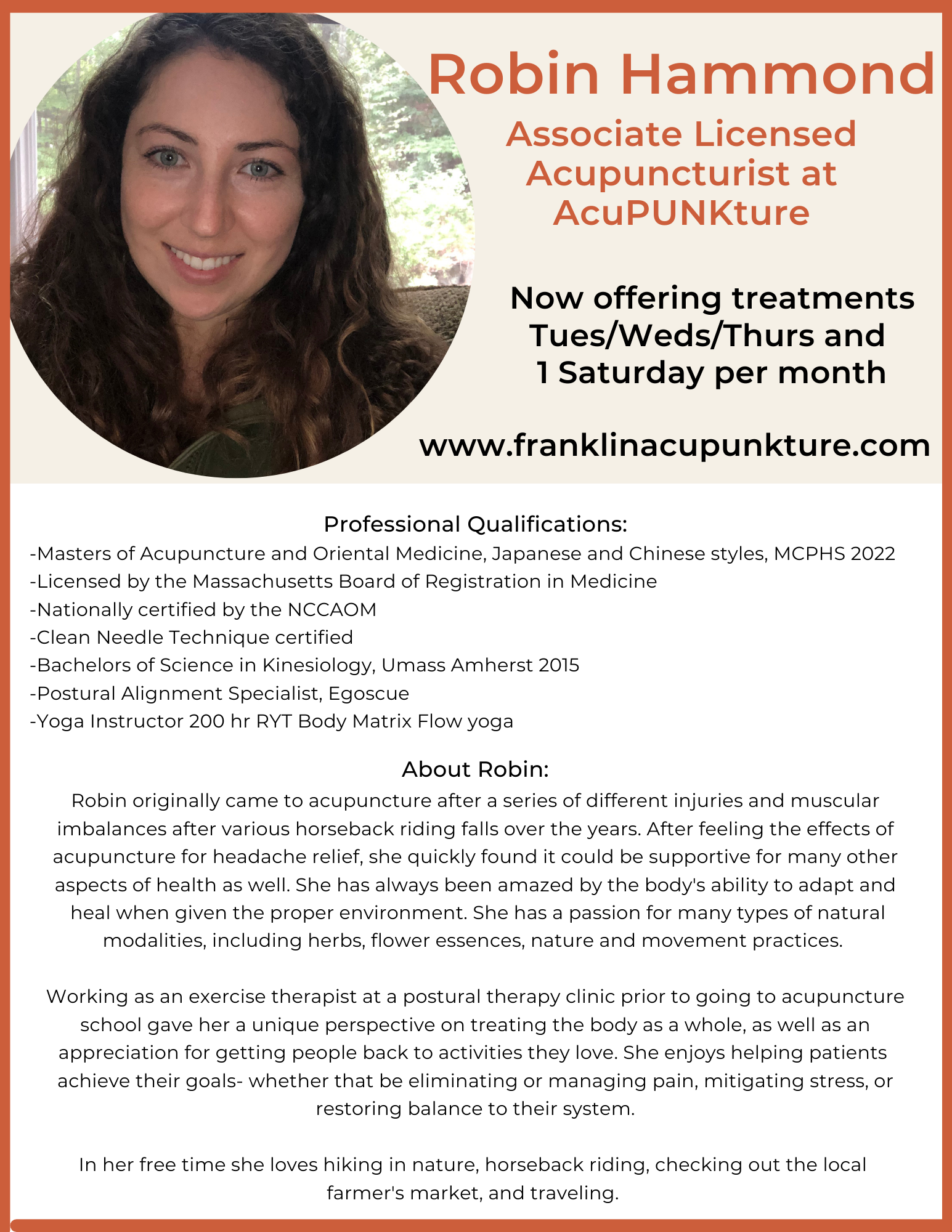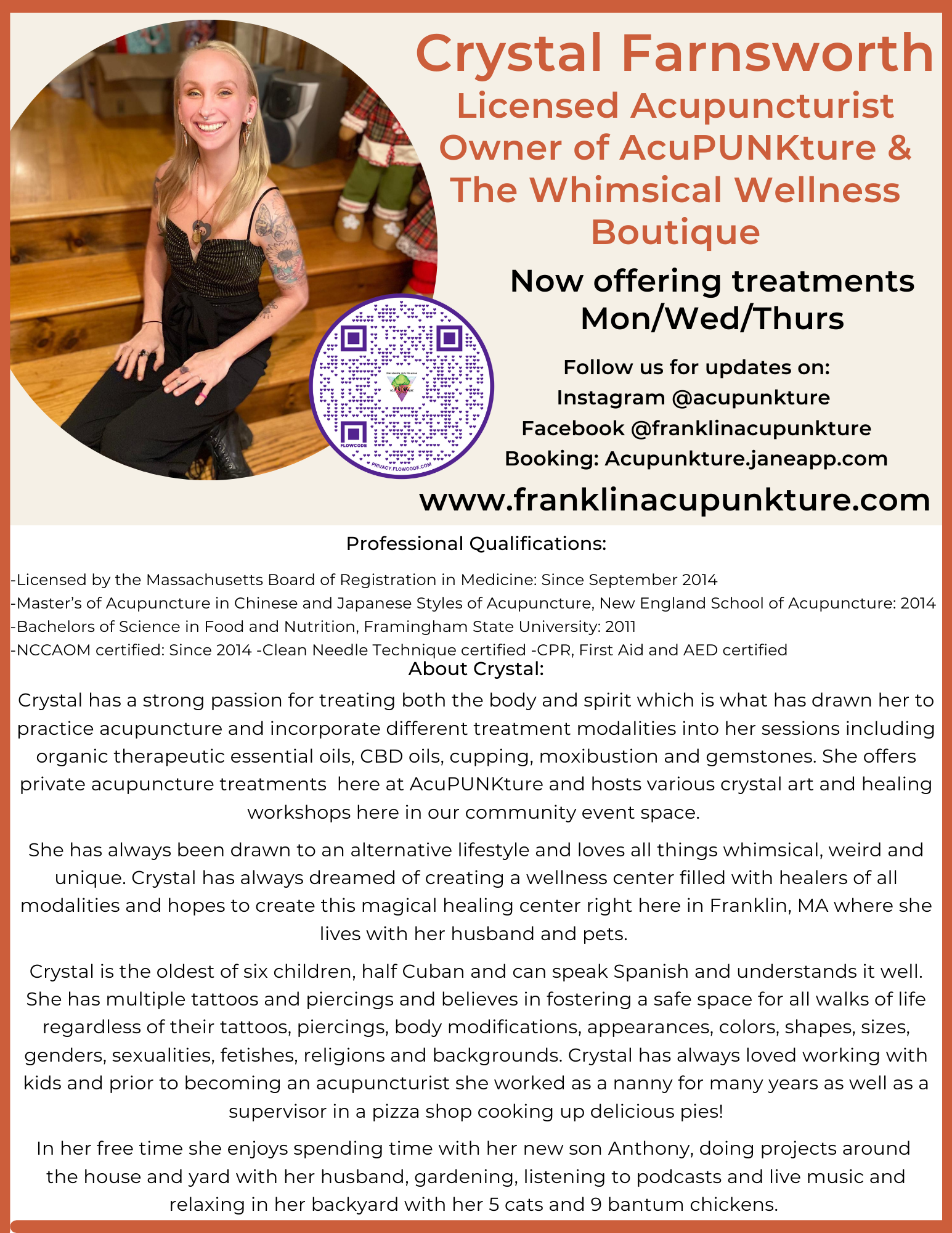 Meet our Acupuncturists: Now Accepting New Patients! acupuncture, acuPUNKture, energy healing, Uncategorized AcuPUNKture is happy to announce that we are currently accepting new patients! We take a wide range of insurance plans and are happy to check your specific coverage. To get started: Call/Text 508-507-8015 or email FranklinAcupunkture@gmail.com Meet our Acupuncturists: Share this: Click to email a link to a friend (Opens in new window) Email Click to share on X (Opens in new window) X Click to print (Opens in new window) Print Click to share on Facebook (Opens in new window) Facebook Click to share on LinkedIn (Opens in new window) LinkedIn Click to share on Pinterest (Opens in new window) Pinterest Click to share on Tumblr (Opens in new window) Tumblr Click to share on Reddit (Opens in new window) Reddit Like Loading... Related